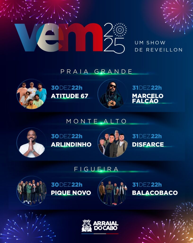 Tem alguém ansioso aí? A Prefeitura de Arraial do Cabo, um dos destinos mais procurados no litoral do RJ, preparou uma programação musical diversificada para o Réveillon 2025 em diferentes localidades do município.