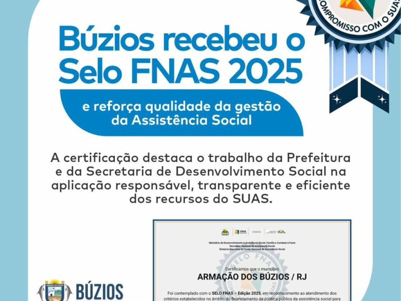 O município de Armação dos Búzios foi contemplado com o Selo FNAS – Edição 2025, concedido pelo Fundo Nacional de Assistência Social, em reconhecimento ao cumprimento dos critérios estabelecidos no âmbito do financiamento da política pública de assistência social.