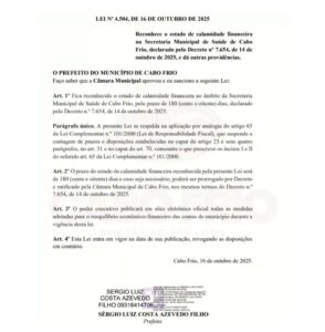 O prefeito de Cabo Frio, Dr. Serginho (PL), sancionou, no Diário Oficial da última quinta-feira (16), a lei que reconhece o estado de calamidade financeira na Secretaria Municipal de Saúde pelo prazo de 180 dias. A medida foi aprovada pela Câmara da cidade. O prazo pode ser prorrogado por decreto e ratificado pelo legislativo municipal, caso seja necessário.
