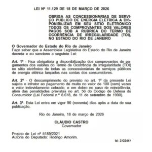 O governador Cláudio Castro (PL) sancionou, nesta quinta-feira (19), uma lei que obriga as concessionárias de energia elétrica do estado do Rio a disponibilizarem, em seus sites oficiais, todos os comprovantes de valores pagos sob a rubrica do Termo de Ocorrência de Irregularidade (TOI).
