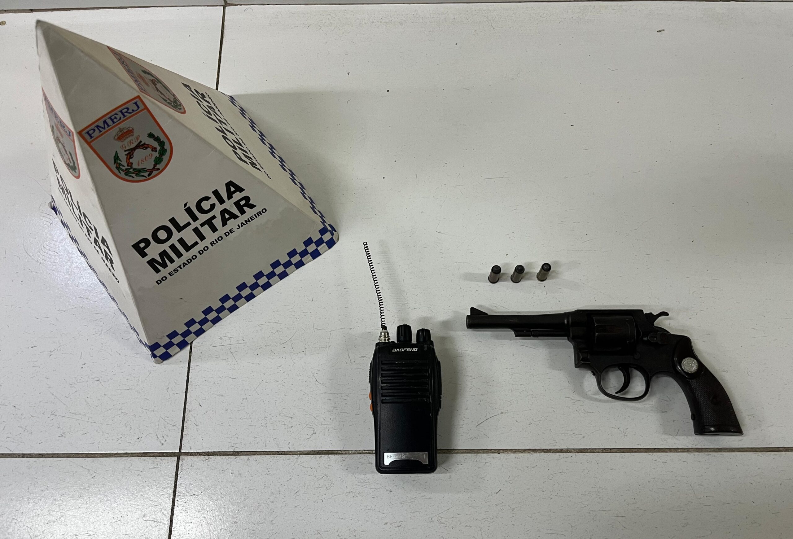 Durante a revista, os Militares encontraram na cintura do suspeito, de 36 anos, um revólver calibre 32 e um rádio transmissor.