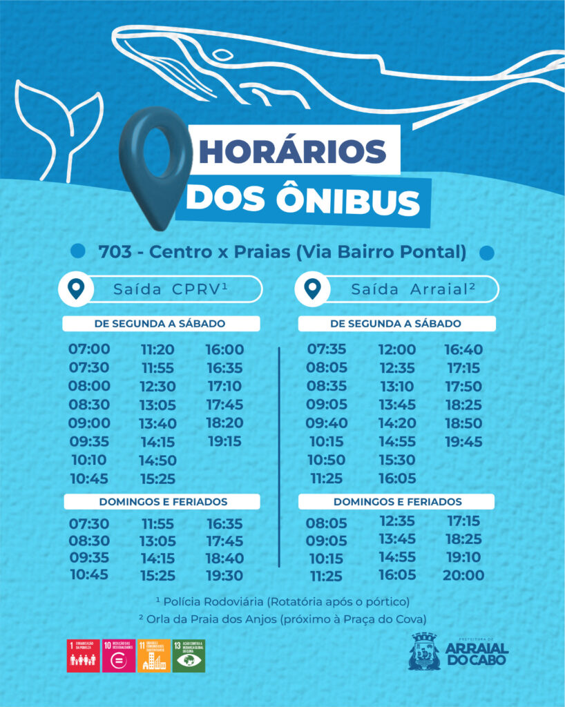 A população de Arraial do Cabo já pode conferir os horários da linha 703, que fará o trajeto circular Centro x Praias, passando pelos bairros Pontal e Vila. A novidade integra o novo Sistema Municipal de Transporte Público Coletivo, lançado pela Prefeitura de Arraial do Cabo para ampliar a mobilidade urbana no município.