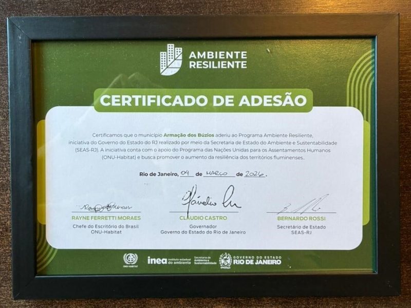 A Prefeitura de Armação dos Búzios, por meio da Secretaria de Clima e Sustentabilidade, oficializou a adesão ao Programa Ambiente Resiliente, em cerimônia realizada no Rio de Janeiro. A iniciativa é coordenada pela Secretaria de Estado do Ambiente e Sustentabilidade (SEAS-RJ), com apoio técnico do ONU-Habitat (Programa das Nações Unidas para os Assentamentos Humanos), e marca um avanço estratégico do município no enfrentamento às mudanças climáticas.