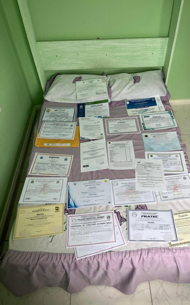Durante as buscas, foram apreendidos celulares, um disco rígido, cerca de 20 diplomas falsos e outros documentos. Todo o material será analisado para identificar mais envolvidos e possíveis compradores dos certificados.Os investigados podem responder por organização criminosa e falsificação de documento público.