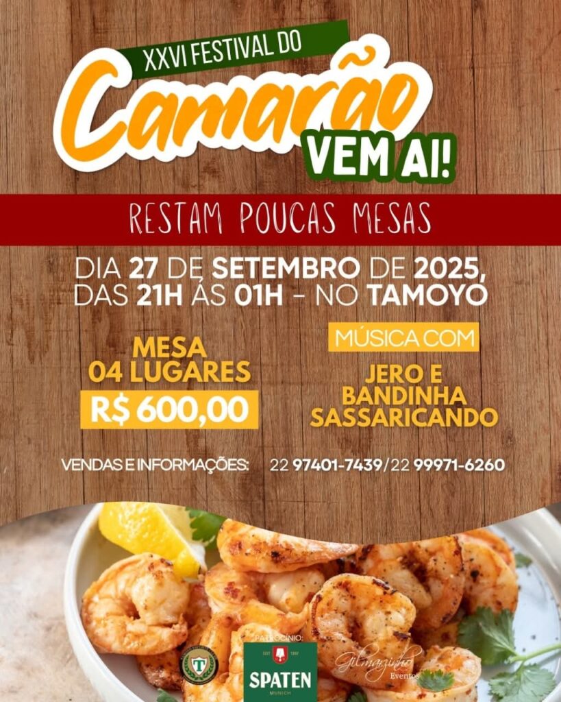 O 26° Festival do camarão, do renomado chefe Gilmarzinho, promete agitar a noite cabofriense!