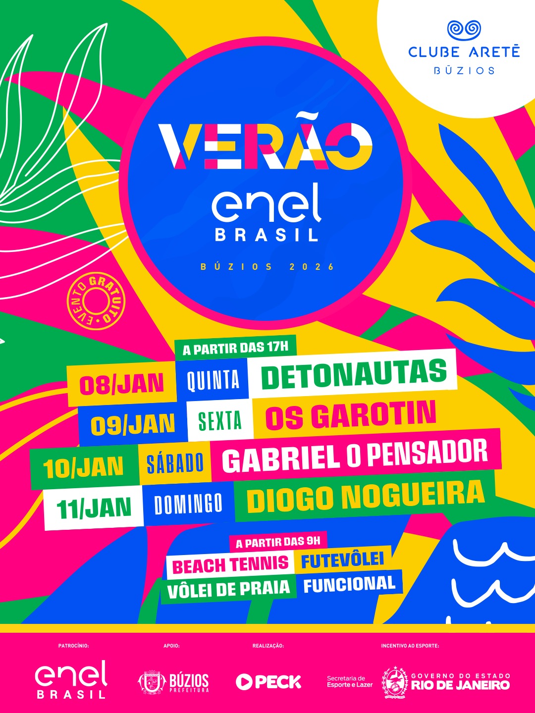 A cidade de Búzios, no Rio de Janeiro, se prepara para receber a primeira edição do Verão Enel Brasil 2026, um evento inédito e totalmente gratuito que promete movimentar o litoral fluminense com uma programação completa de música, esporte, lazer, saúde e bem-estar. A programação acontecerá de 06 a 11 de janeiro de 2026, no Clube Aretê (Av. José Bento Ribeiro Dantas, 8300 – Búzios), um espaço que valoriza a sustentabilidade e o estilo de vida ao ar livre. Ao longo dos seis dias de evento, o público poderá participar de atividades esportivas, experiências voltadas à saúde e qualidade de vida, além de shows de artistas renomados da música brasileira.